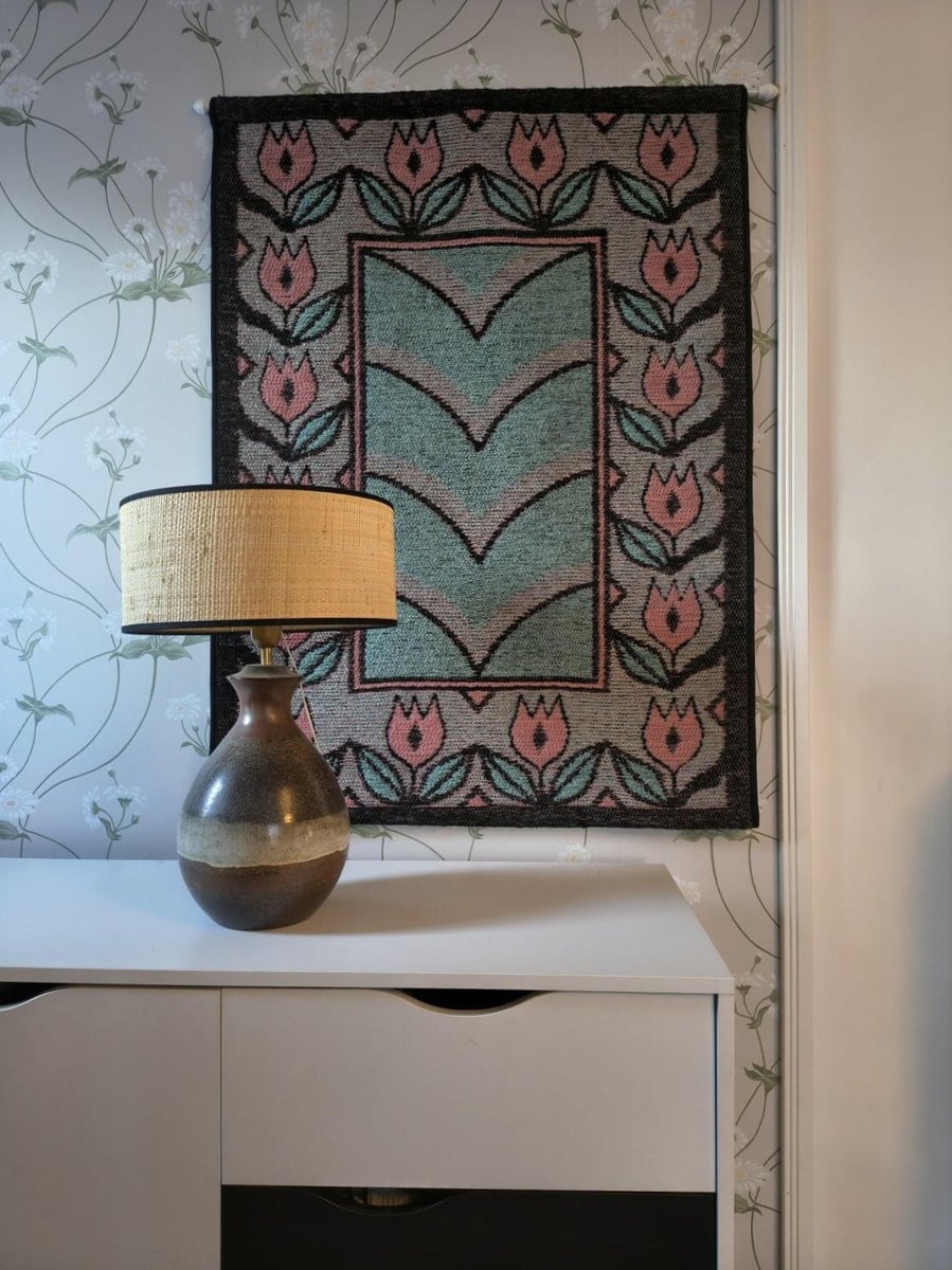 Kaunis iso seinävaate, jonka reunaa kiertää tyylitelty tulppaanikuvio. Keskiosan graafinen ja symmetrinen sommittelu luo vahvan visuaalisen kontrastin vaaleanpunaisen, turkoosin ja murrettujen sävyjen välillä. Tämä seinävaate on upea esimerkki kotimaisesta tekstiilitaiteesta ja sopii katseenvangitsijaksi niin moderniin kuin perinteiseenkin sisustukseen.